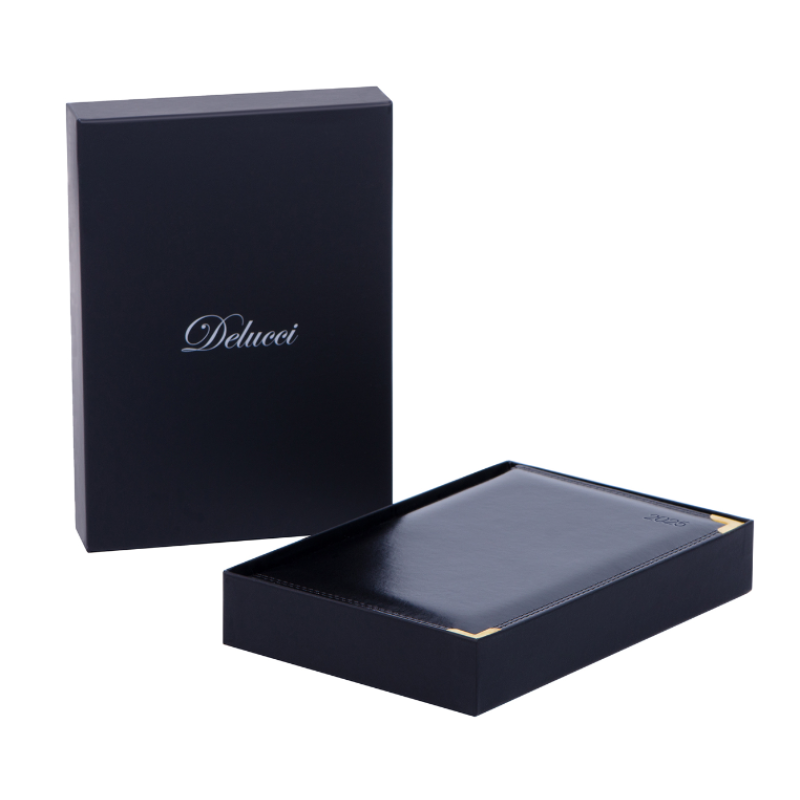 Изысканный датированный ежедневник Delucci формата A5 (150*215 мм) − элегантный помощник для планирования. Обложка с поролоновой прослойкой изготовлена из премиальной глянцевой экокожи, имитирующей кожу первоклассной выделки, и прошита двойной строчкой. Цвет обложки − черный. Изделие дополняют золотые металлические уголки и золотой фольгированный срез.