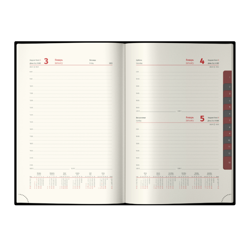 Внутренний блок состоит из 184 листов высококачественной кремовой бумаги повышенной плотности 80 г/м2 с пантонной печатью блока в 2 краски. Блок имеет перфорированные уголки. Справочный материал, 2 удобных закладки-ляссе, отрывные заметки, бланки-извещения о ДТП и вырубной блок по неделям гарантируют комфорт при использовании ежедневника. Изделие подходит под персонализацию. Упаковано в подарочную матовую индивидуальную упаковку. Обладателя ежедневника также порадуют 3 комплекта стикеров.
