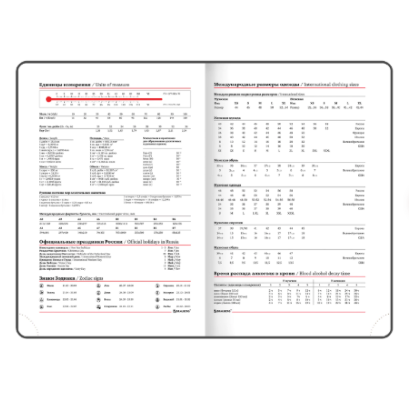Внутренний блок включает 160 листов белой бумаги плотностью 70 г/м2. Каждая страничка имеет перфорированный угол. Благодаря стандартному формату А5 ежедневник удобно использовать как в офисе, так и на выездных деловых встречах.