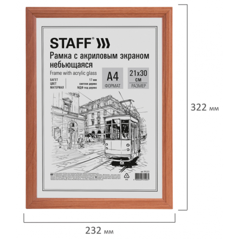 Рамка STAFF "Carven" для фотографий, дипломов, сертификатов, грамот и других ценных документов гармонично будет смотреться как в офисном, так и в домашнем интерьере, а также в салонах и предприятиях, в магазинах и различных учреждениях. Рамка формата А4 (21х30 см) выполнена из МДФ под дерево в цвете "светлое дерево", за счет чего отлично впишется в домашний и деловой интерьер. Имеется возможность вертикального и горизонтального подвеса. Ширина багета - 17 мм. Благодаря экрану из акрилового стекла рамка является менее хрупкой. Микрогофрокартон обеспечивает плотное прилегание и отсутствие в будущем деформации содержимого в рамке. Поставляется в термоусадочной пленке, которая гарантирует сохранность рамки при транспортировке, отсутствие сколов и потертостей. Рамка STAFF - универсальный предмет интерьера, который создаст уют в любом помещении.