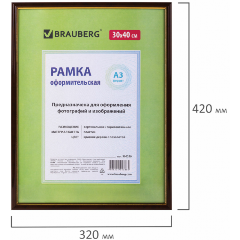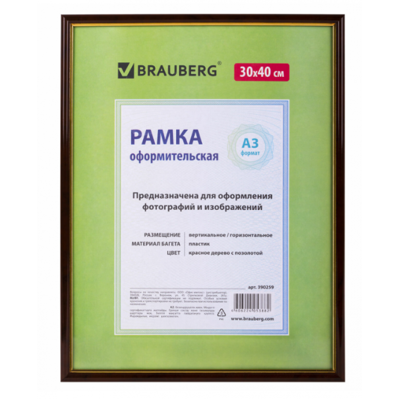 Рамка BRAUBERG "HIT" для оформления фотографий, дипломов, сертификатов, грамот, лицензий и других документов формата А3 (30х40 см) будет гармонично смотреться в любом интерьере - дома и офисе, учебных учреждениях и магазинах, салонах и предприятий и др.