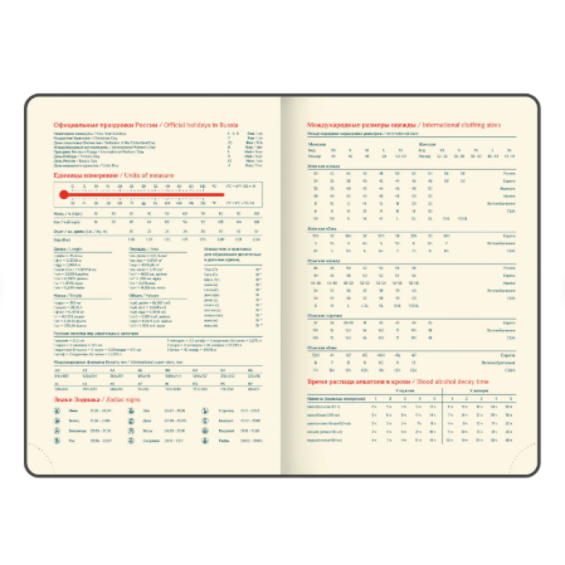 Дополнением является закладка-ляссе, с помощью которой при необходимости можно быстро открыть ежедневник на нужной странице, а также вырубка по месяцам. Ежедневник снабжен обширным справочным материалом. В конце есть 6 страниц для записей и заметок.