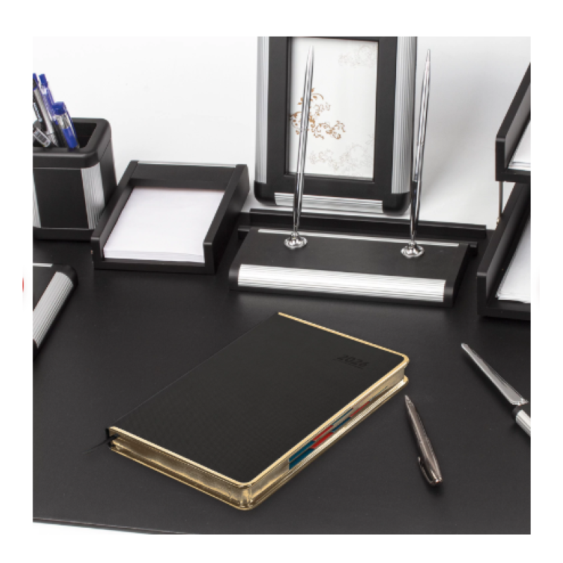 Внутренний блок включает 168 листов тонированной бумаги цвета "слоновая кость" плотностью 70 г/м2. Каждая страничка имеет перфорированный угол. Благодаря стандартному формату А5 (148х218 мм) ежедневник удобно использовать как в офисе, так и на выездных деловых встречах. Твердая обложка черного цвета выполнена под кожу с отделкой из металлических накладок, что увеличивает ее износоустойчивость. Срез ежедневника покрыт золотой фольгой в цвет металлических накладок, и это придает ему особый шарм. Материал обложки подходит для горячего тиснения.