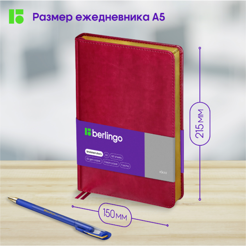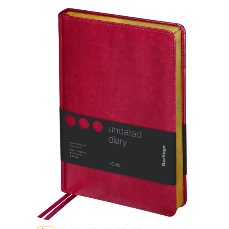 Оригинальный недатированный ежедневник Berlingo xGold формата А5 с твердой обложкой из экокожи и поролоновой прослойкой понравится каждому. Золотой фольгированный срез красиво подчеркивает обложку цвета яркой фуксии. Внутренний блок состоит из 160 листов высококачественной кремовой бумаги повышенной плотности 80 г/м² с пантонной печатью в 2 краски. Размер недатированного ежедневника – 150 на 215 мм.