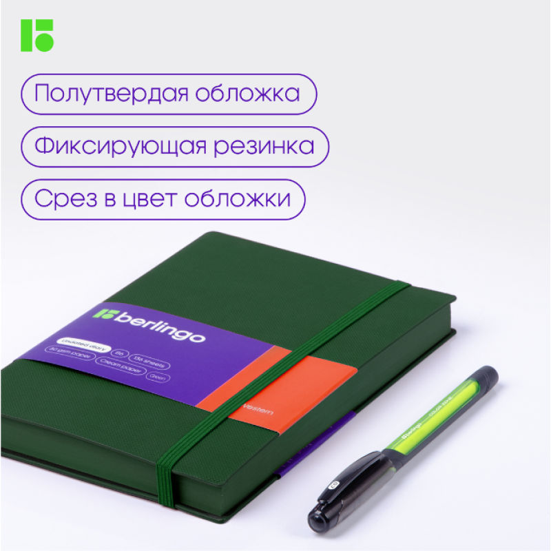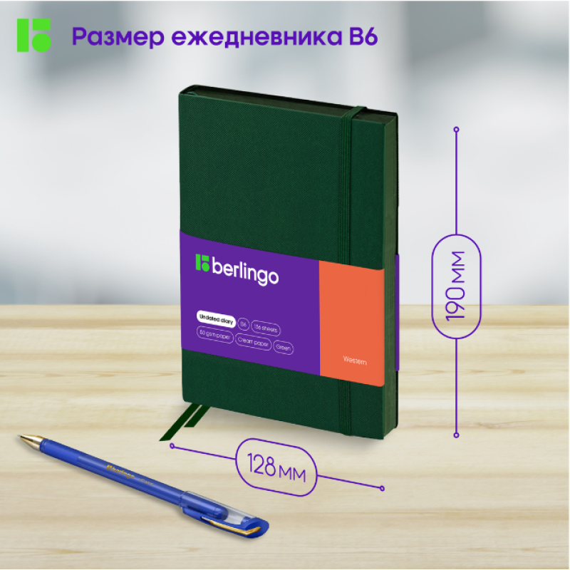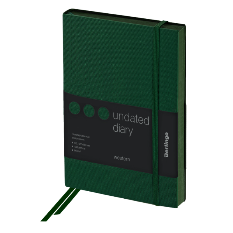 Компактный ежедневник Berlingo Western формата B6 в зелёной мягкой обложке из высококачественной экокожи. Изделие надёжно закрывает внешняя резинка, которая отлично дополняет общий дизайн вместе с зелёным срезом. Внутренний блок состоит из 136 листов высококачественной кремовой бумаги повышенной плотности 80 г/м² с пантонной печатью в 2 краски. Недатированный ежедневник Berlingo Western представлен в размере 122 на 183 мм.