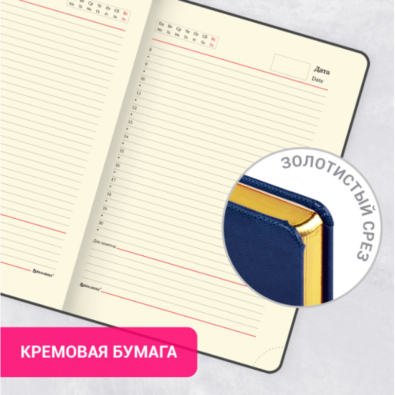 Внутренний блок включает 160 листов тонированной бумаги плотностью 70 г/м2. Каждая страничка имеет перфорированный угол. Благодаря стандартному формату А5 ежедневник удобно использовать как в офисе, так и на выездных деловых встречах. Твердая обложка, стилизованная под кожу рептилии, подходит для горячего тиснения. Срез ежедневника фольгирован под "золото", что придает ему особый шарм. Дополнением является закладка-ляссе, с помощью которой при необходимости можно быстро открыть ежедневник на нужной странице. Помимо прочего ежедневник снабжен обширным справочным материалом.
