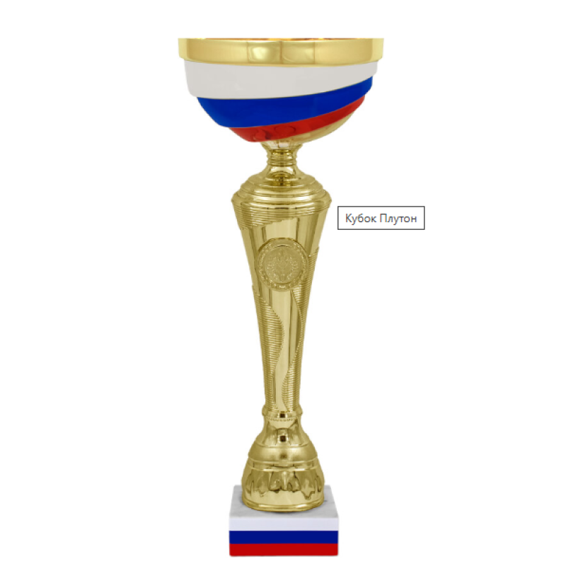 Серия кубков переменной высоты и традиционной формы с элегантными чашами из металла, изысканными стемами из пластика и декорирована Российским триколором